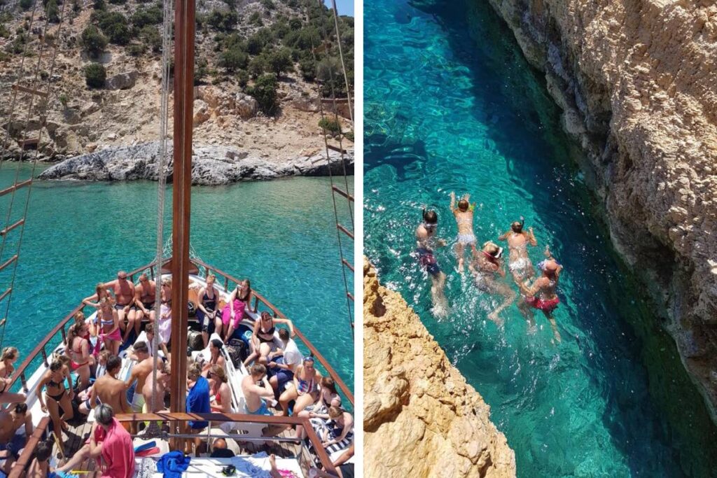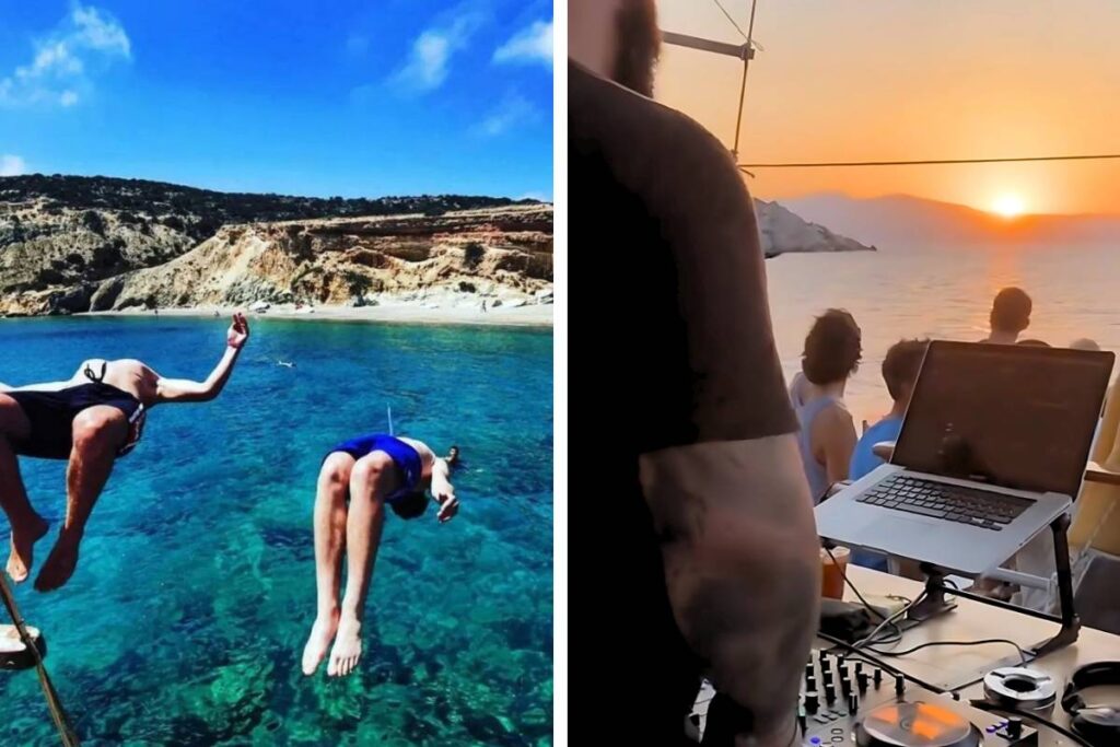 Η εμπειρία ξεκινά νωρίς το πρωί από το λιμανάκι της Αγίας Άννας. Αντιηλιακό, πετσέτα, τσεκ. Κάθεσαι σ’ένα από τα μαξιλάρια και τους χώρους καθιστικού στο κατάστρωμα ή ακόμα και στο ευρύχωρο σαλόνι του εσωτερικού και η περιπέτεια ξεκινάει! Μετά έρχεται η περιήγηση στα γαλαζοπράσινα νερά, παρθένα, ανέγγιχτα από τη λαίλαπα του beach bar.