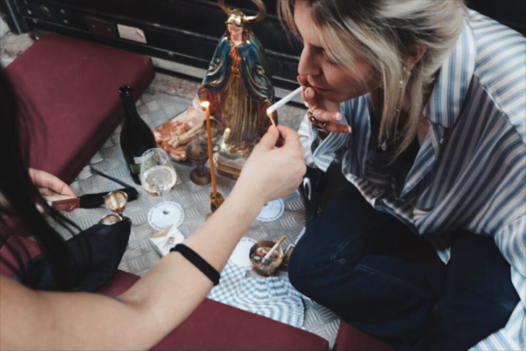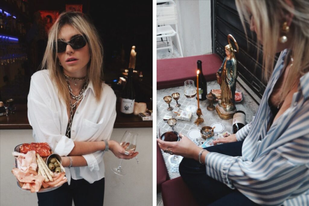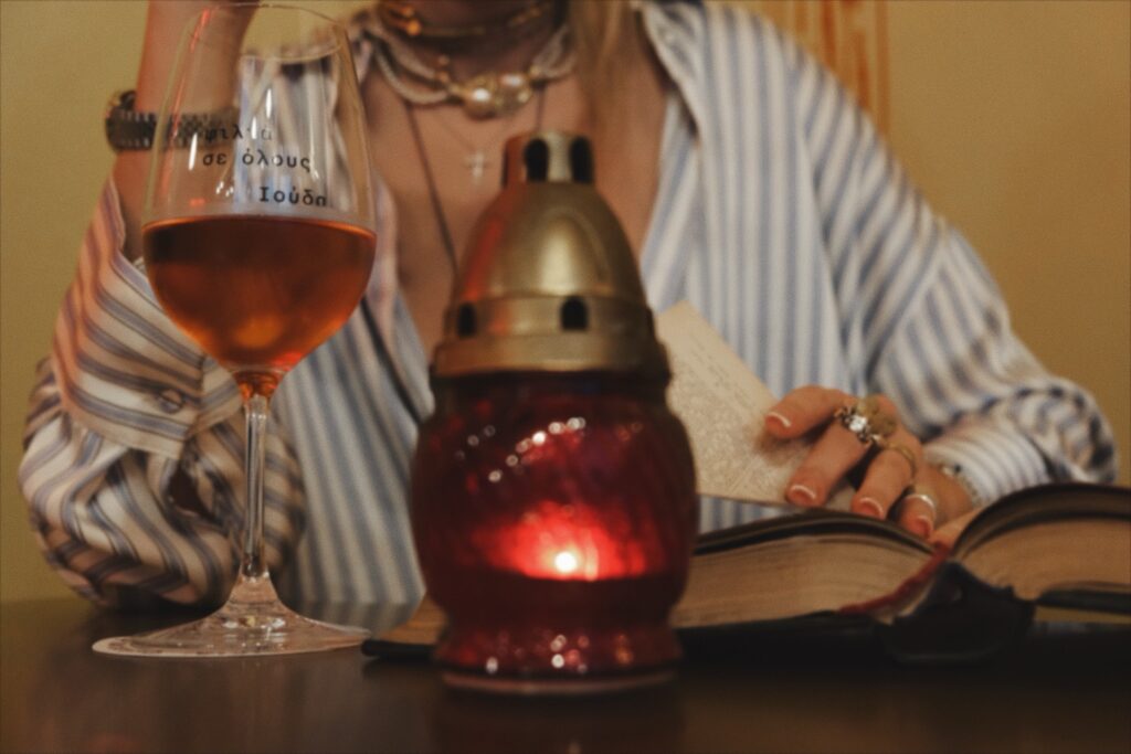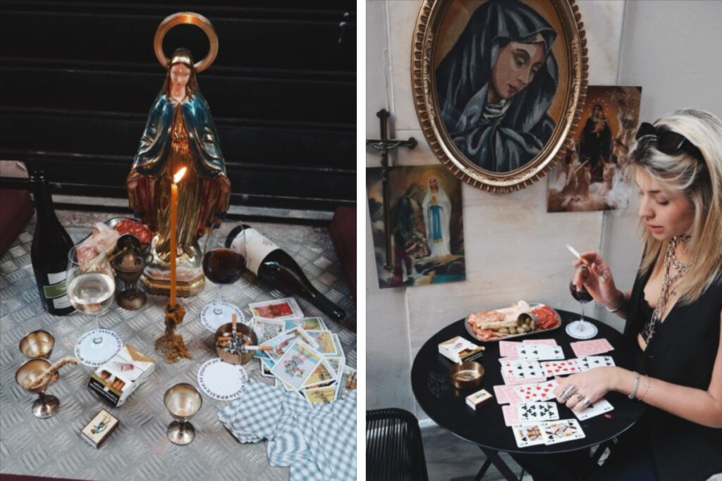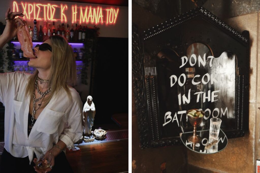 Στο έμπα θα αναφωνήσεις ασυνείδητα «Ο Χριστός κι η Μάνα Του», αφού δεις το ομώνυμο motto που δεσπόζει σε περίοπτη θέση πάνω από το μπαρ, σα νεο-βιβλικό ευαγγέλιο, μια ατάκα που η γλυκύτατη Εβελίνα – η ιδιοκτήτρια που επιμελήθηκε με χιούμορ και πολύ ωραία αισθητική το ντιζάϊν – χρησιμοποιούσε και χρησιμοποιεί με τις φίλες της, τις στιγμές που θέλουν να εκφράσουν τον ενθουσιασμό τους. Ακριβώς μπροστά, μια Παναγιά που προσεύχεται, τριγύρω τοιχογραφίες, ωραία βάϊμπς, πραγματική σύγχρονη τέχνη.