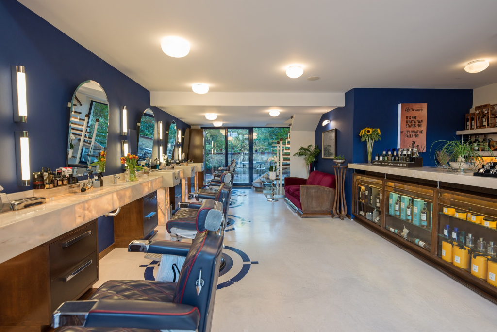 Το περιβάλλον του από την άλλη θυμίζει ταινία του Humphrey Bogart. Καμπύλες γραμμές, βελούδινα καθίσματα, μπλε αποχρώσεις και μια αίσθηση φινέτσας, είναι στοιχεία που κι αυτά σε βάζουν σε κοσμοπολίτικο mood από την πρώτη στιγμή. Στα δεξιά, η εντυπωσιακή, απαστράπτουσα μπάρα σερβίρει Dewar’s ή έναν αρωματικό καφέ Delonghi, πριν ξεκινήσει η τελετουργία του hot towel shave. Οι πόροι καθαρίζουν, το πρόσωπο φωτίζει, (ξανα)βρίσκεσαι στην καλυτερή σου εκδοχή.