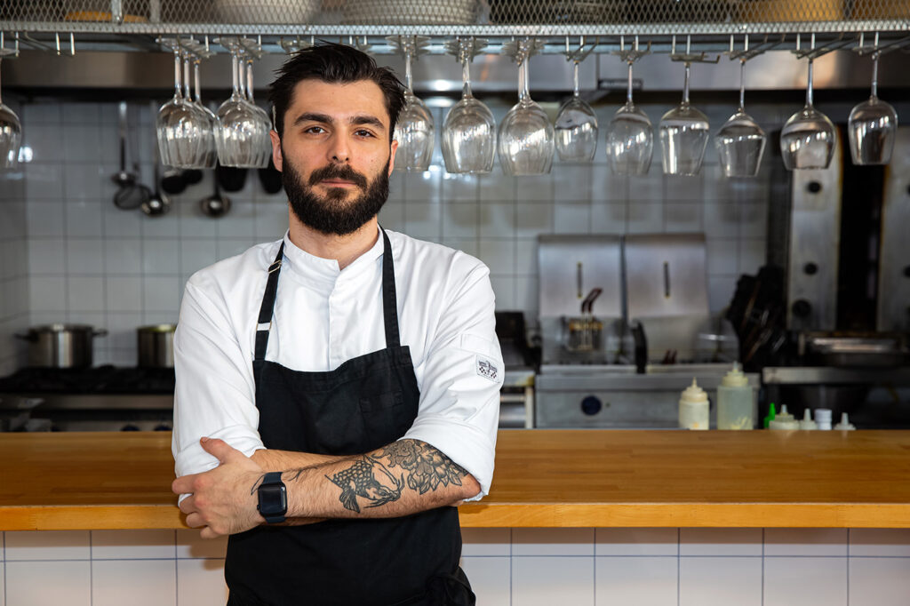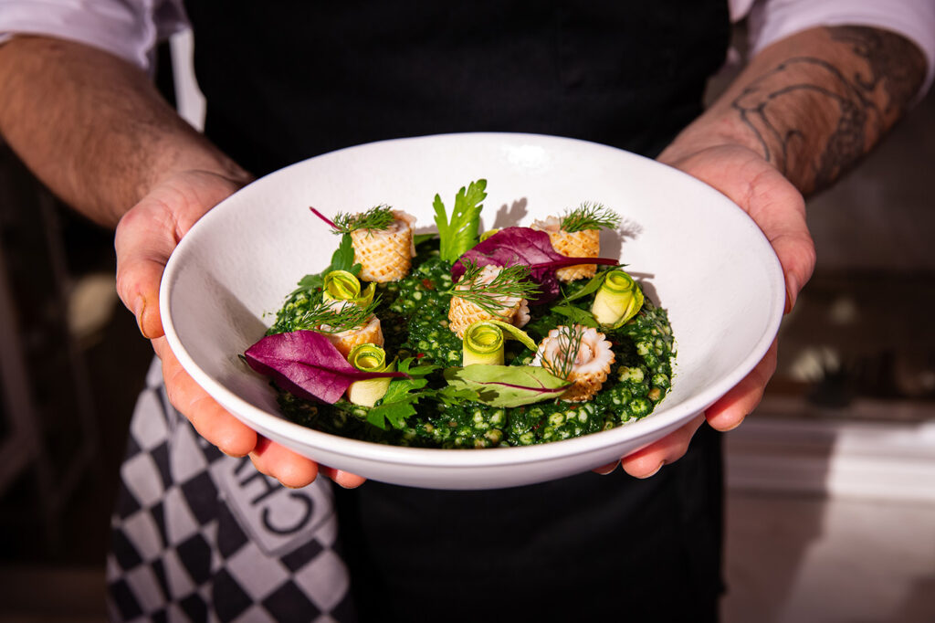 Στην κουζίνα, η λογική είναι μία: Τίποτα δεν πάει χαμένο. Τα φιλέτα γίνονται ωμές και ζεστές παρασκευές, τα κόκκαλα ζωμοί και βάσεις, το κεφάλι μαγειρεύεται με τρόπο που αναδεικνύει όλο τον πλούτο της πρώτης ύλης. Η τεχνική εμπνέεται από την ιαπωνική κουζίνα, ενώ οι γεύσεις πατούν στην ελληνική εποχικότητα: χόρτα, λαχανικά, μυρωδικά και εσπεριδοειδή που είναι στα καλύτερά τους.