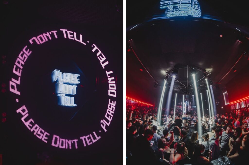 Η φιλοσοφία του είναι απλή και ξεκάθαρη: εδώ έρχεσαι για να ζήσεις τη νύχτα χωρίς όρια. Η εμπειρία είναι έντονη, γεμάτη ενέργεια, με premium εξυπηρέτηση, ωραία μουσική και μια ατμόσφαιρα που σε παρασύρει από την πρώτη στιγμή. Στο λεξιλόγιό του δεν υπάρχει το«χαλαρά για ένα ποτό». Το Please Don’t Tell είναι φτιαγμένο για βραδιές που κρατούν μέχρι το πρωί.