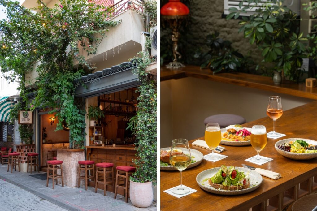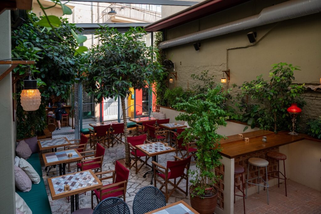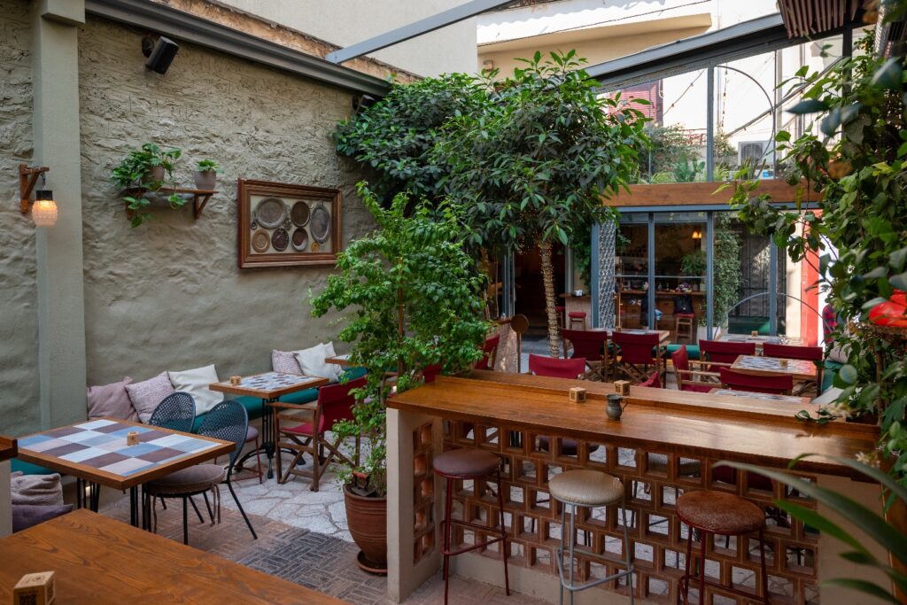 Η εξωτερική του όψη, «ντυμένη» στην πυκνή αναρριχώμενη βλάστηση, προϊδεάζει για την εμπειρία που ακολουθεί: έναν κρυφό κήπο με ανοιγόμενη οροφή και μια εσωτερική αρχιτεκτονική που παίζει με τις πέτρινες καμάρες, τους θόλους και τον ζεστό, ατμοσφαιρικό φωτισμό από τα vintage κρεμαστά φανάρια. Είναι ένα σημείο που λειτουργεί ως πραγματικό καταφύγιο όλες τις εποχές, προσφέροντας αυτή τη σπάνια αίσθηση αποσυμπίεσης που αναζητάμε ανάμεσα στις βόλτες από το Μοναστηράκι προς τον πεζόδρομο της Αποστόλου Παύλου.